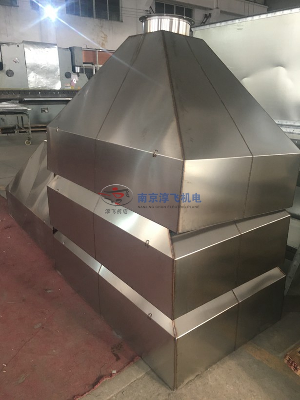 排烟罩是由罩体和罩盖上下两部分构成,罩体由三个平面组成,罩盖由前、后、左、右四个平面(或称挡板)构成一个锥体。其锥体的下端与罩体相连,上端与抽油烟机相连,活动挡板开在罩体或罩盖靠近窗户的任意一面,前挡板带有缺口美观、精致,抽油烟彻底,同时不污染环境,有利于人体健康,结构简单,造价便宜。